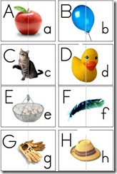 The set has 14 pages of cards{4 cards to a page} with two full sets of alphabet cards. One set that can be cut in half to use as ‘puzzle matching’ and the other can be used as flashcards. Each card has the uppercase letter in the top left corner and the matching lowercase letter in the lower right corner. The cards have a picture in the center that begins with that letter sound. Puzzle cards have a faint gray line down the middle to use as a cutting guide. We’ve printed ours off on cardstock and laminated them to make them stronger.