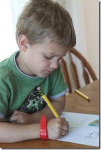 The last few weeks we’ve been using many of the sheets from the packs by sliding them into a page protector and using a dry erase pen or a vis-à-vis pen to do the work. Then on the last day, I pull them out and he uses a pencil to do the actual work on the page. Since I won’t be passing down the packs to another kiddo, I can then save the pages that he’s finished in a folder with his story summary and name strip on the front.