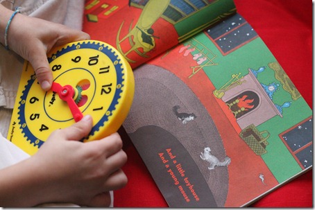 Telling Time ~ Throughout Goodnight Moon there are clocks on the mantle, on the nightstand, etc… that are showing time progressing in 10 minute increments. As we flipped through the book, Kaleb found the clocks and then set our Judy clock to the same time the clock in the book showed. We also practiced counting by 10’s up to 100.